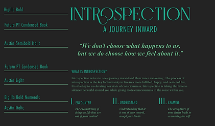 The Introspection brochure serves as an informative piece investigating traditional philosophies of mindfulness and meditation. The brochure is meant to serve as a guide, speaking to the importance of your inner voice, and the perception of self. The four panels are divided into various historical meditative related practices such as stoicism and buddhism and how their beliefs could be applied to your own self reflection.